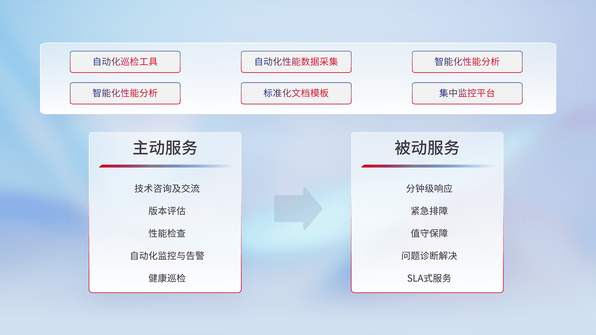 智能化工具和标准化文档,,保障服务质量,,,,提供主动服务(包含技术咨询、、、版本评估、、、性能检查、、、自动化监控与告警、、、健康巡检)和被动服务包含(分钟级响应、、、紧急排障、、、值守保障、、问题诊断解决、、、、SLA服务)。。。